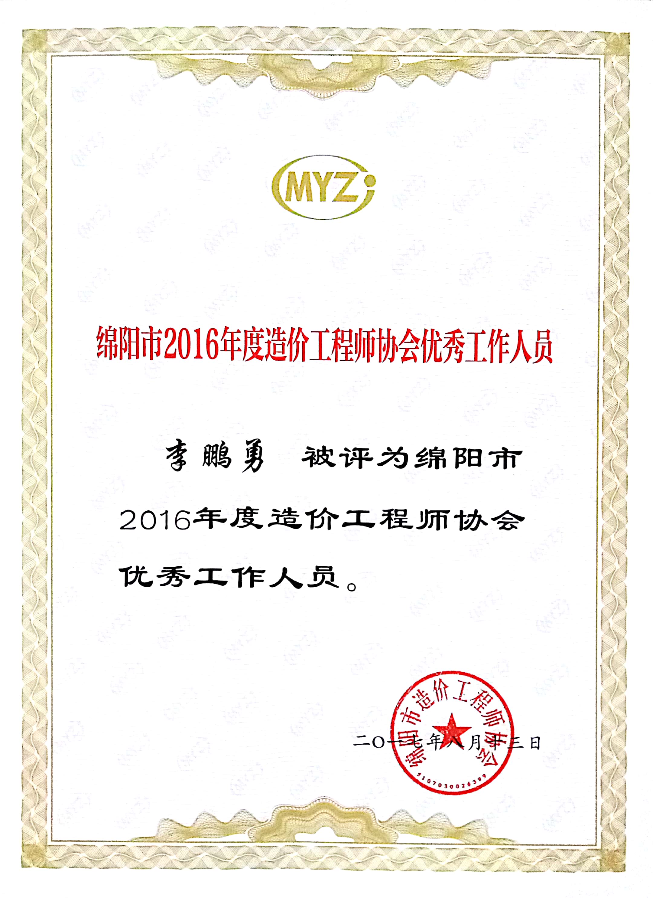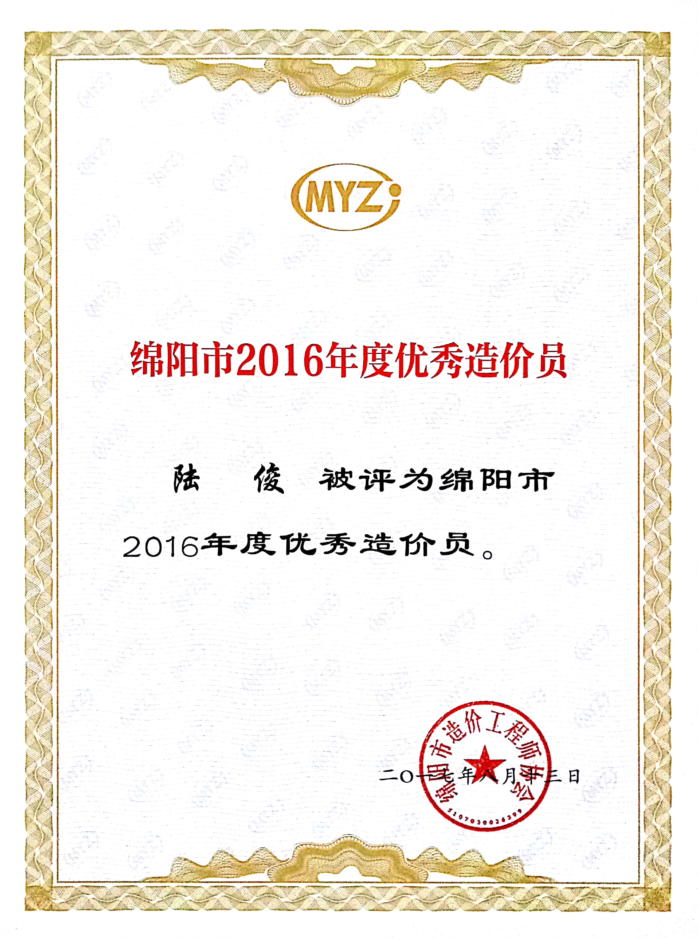 热烈祝贺我公司陆俊、李朋勇被评为2016年度绵阳市优秀造价员